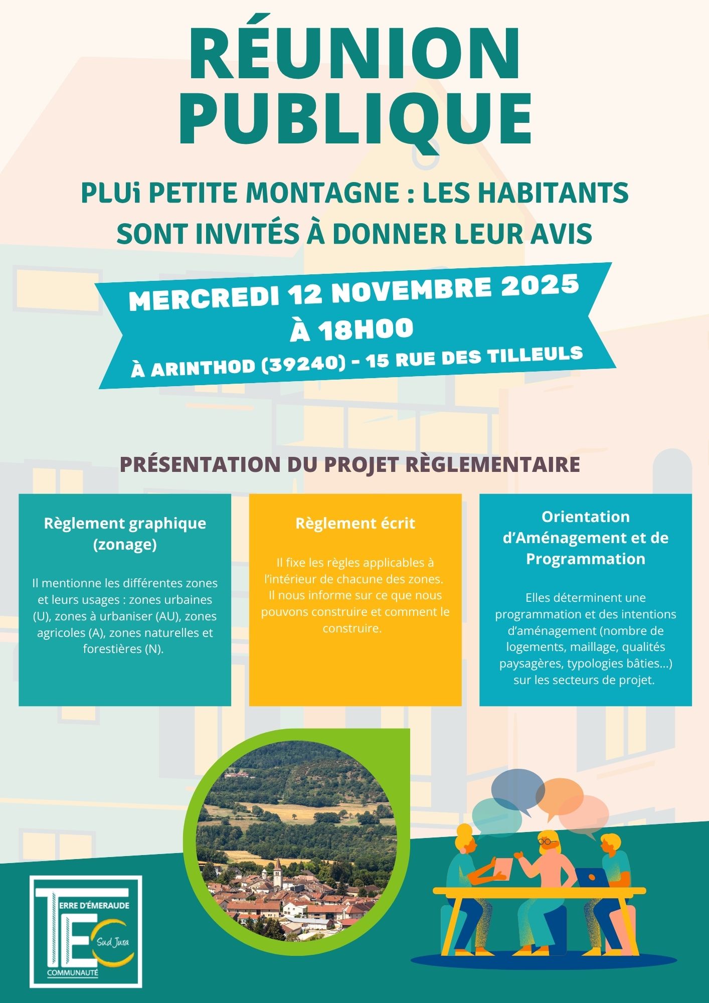 Lors de cette réunion, le projet règlementaire sera présenté (Règlement graphique / zonage, règlement écrit, orientation d'aménagement et de programmation)