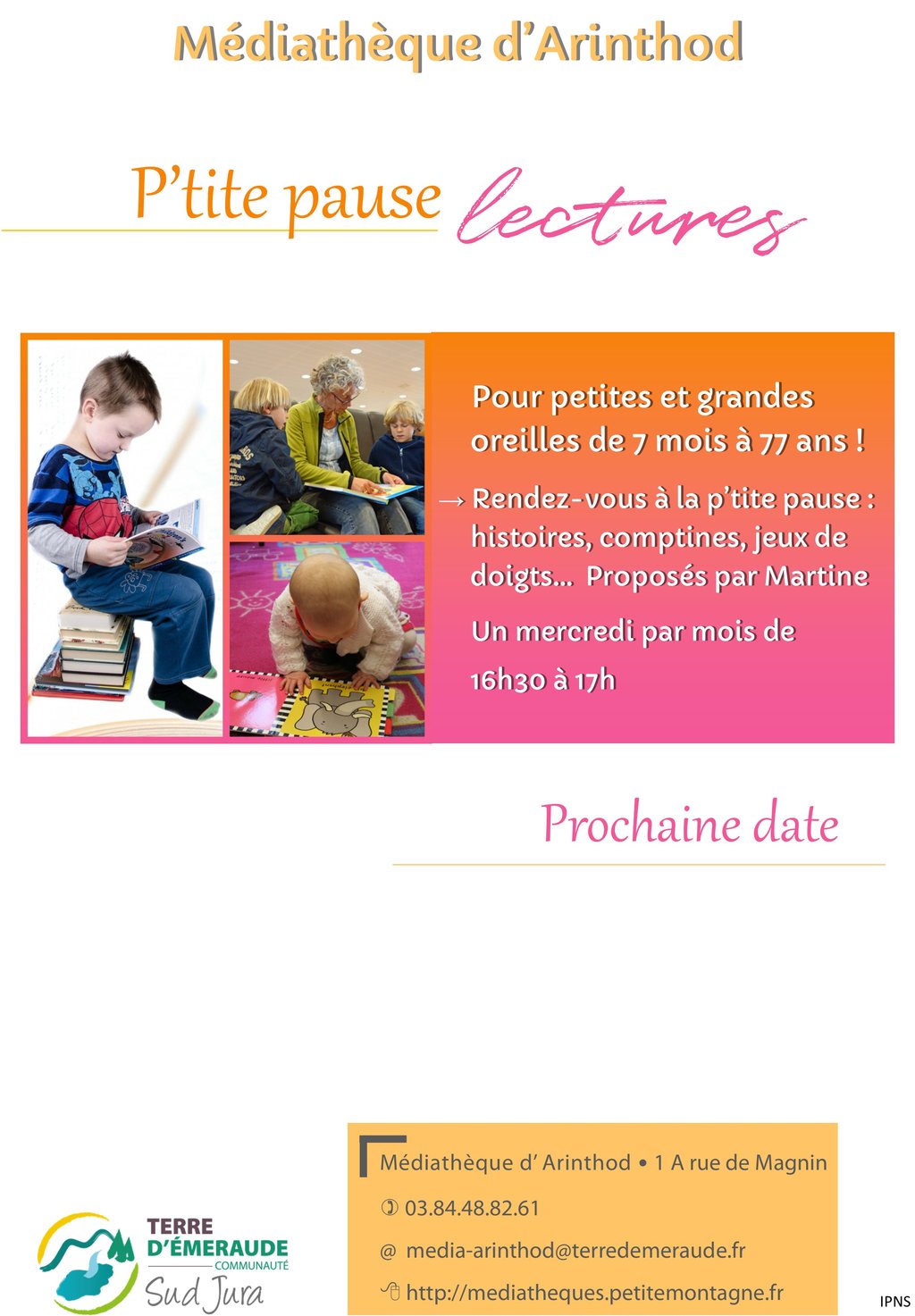 A la médiathèque d’Arinthod, on prend le temps de se détendre pour écouter des histoires. Martine proposera une « p’tite pause lecture » le mercredi 25 février, de 16h30 à 17h, pour petites et grandes oreilles. Tout public. Gratuit. Réservation conseillée.