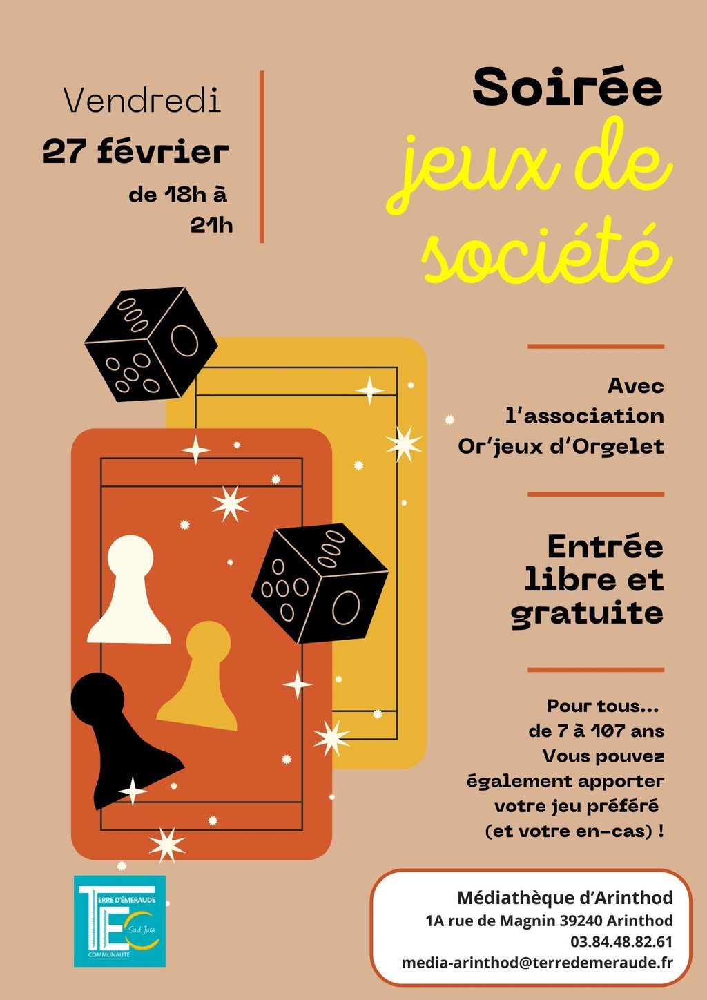 La médiathèque d’Arinthod et l’association « Les Or’Jeux » proposeront de découvrir et de jouer à des jeux de société. Vendredi 27 février de 18h à 21h. Public familial à partir de 7 ans. Gratuit. Sur réservation.